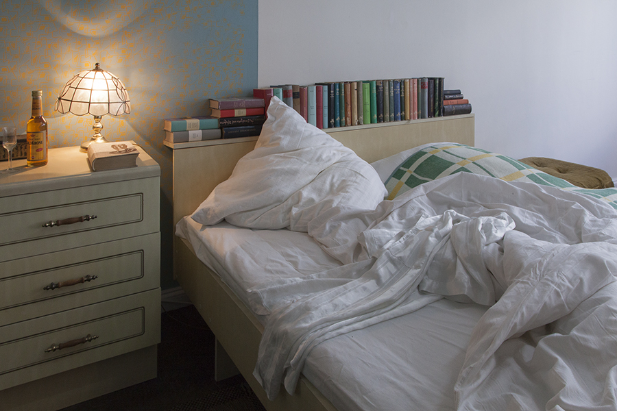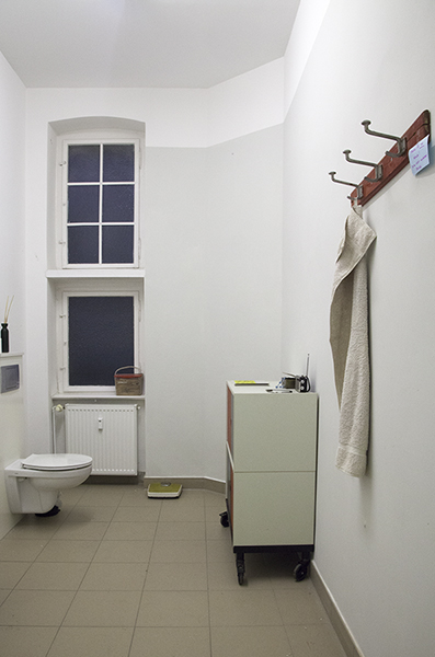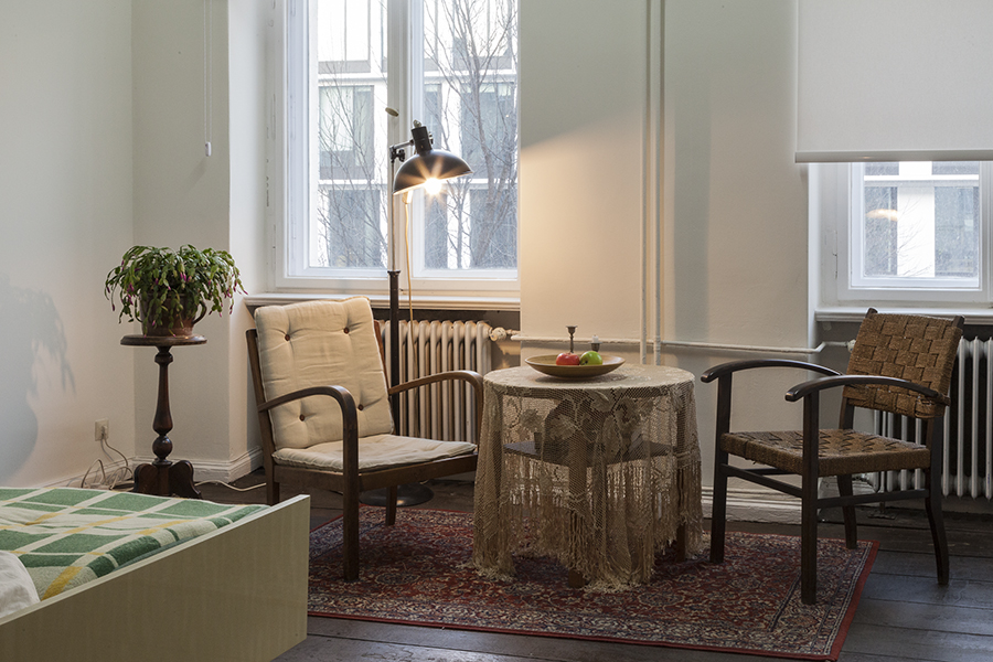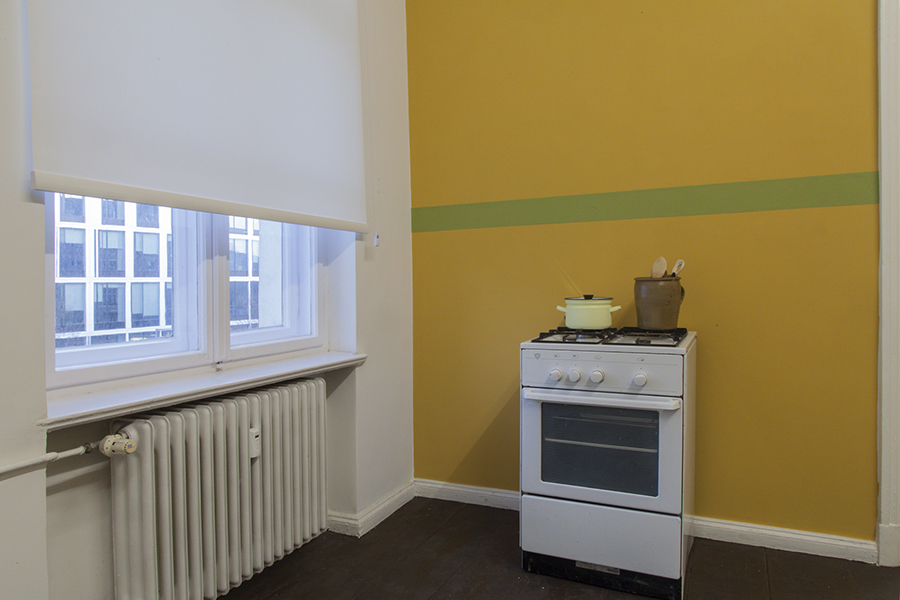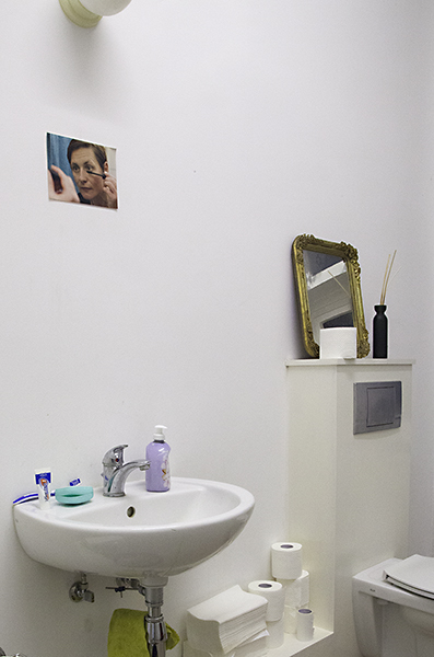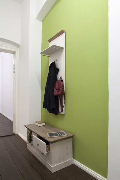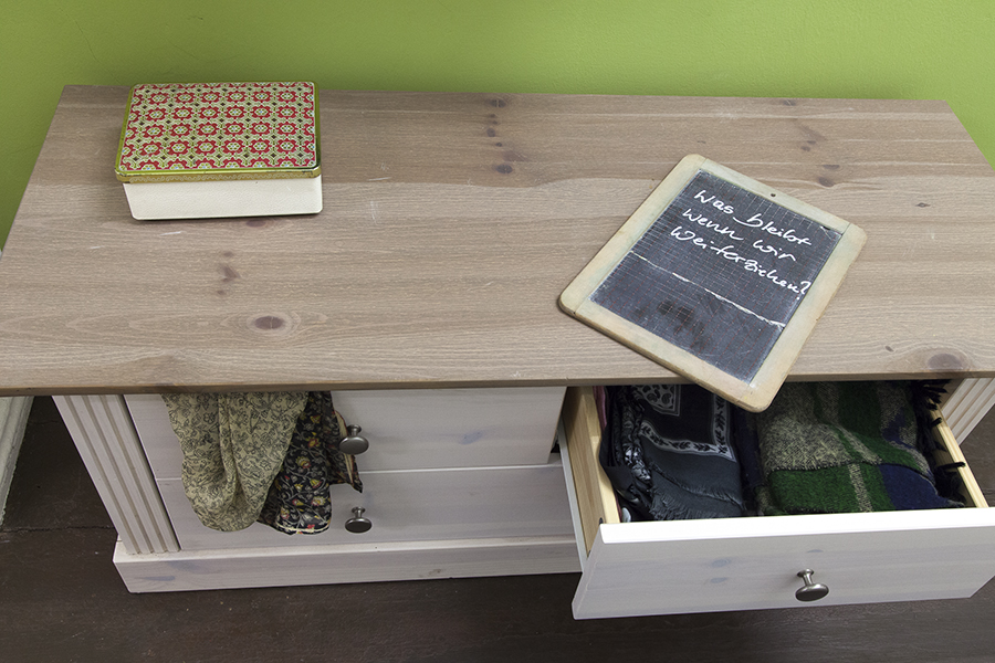 Im ersten Teil der Installation schafft die Künstlerin eine subtile, beinahe surreale Atmosphäre, indem sie drei Räume der Galerie – ein Schlafzimmer, ein Badezimmer und eine Küche – in scheinbar vertraute Wohnwelten verwandelt. Die Räume sind mit Objekten ausgestattet, die die Künstlerin auf der Straße gefunden hat. Möbelstücke, die ehemals Teil von privaten Räumlichkeiten waren und nun dem öffentlichen Raum überlassen werden. Die Einrichtungsgegenstände und ihre Gebrauchsspuren erzählen von verlorenen Geschichten, von abgelebten Momenten, die nur noch von Ferne nachhallen. Die zusammengelesenen Möbel sprechen von Abwesenden und bergen Potential für neue Geschichten. Im stillen Nachhall findet der Betrachter zur Reflexion über die Bedeutung von Zuhause, von Besitz und von der fortwährenden Weiterbewegung, die unser Dasein prägt.