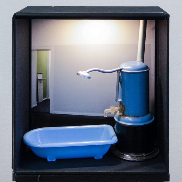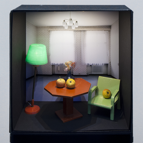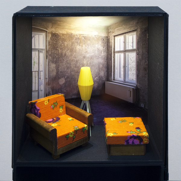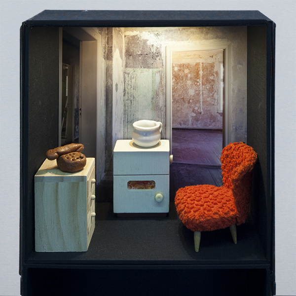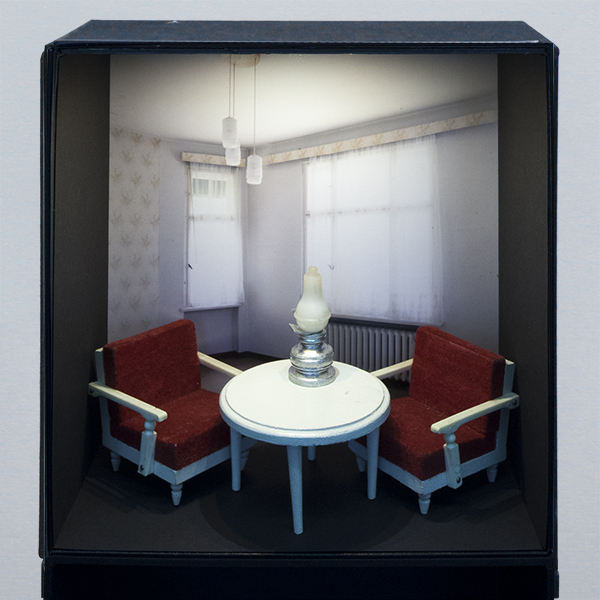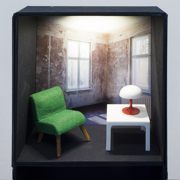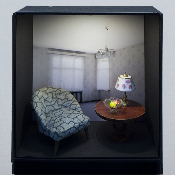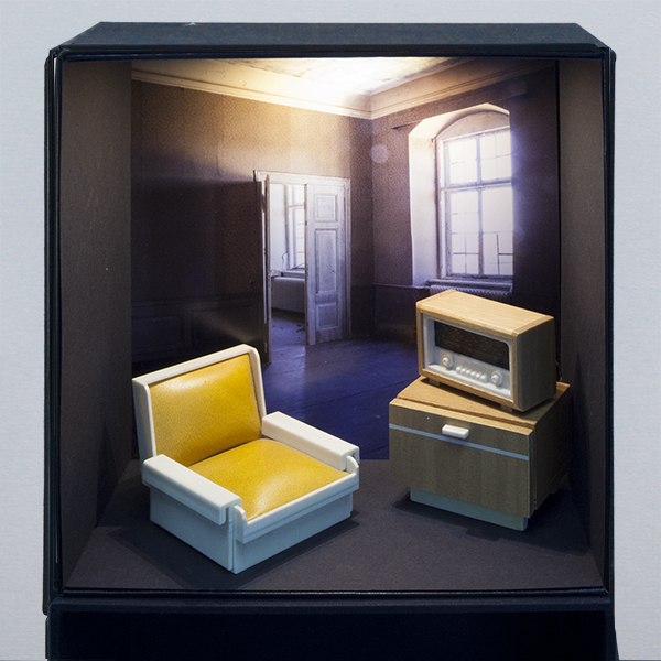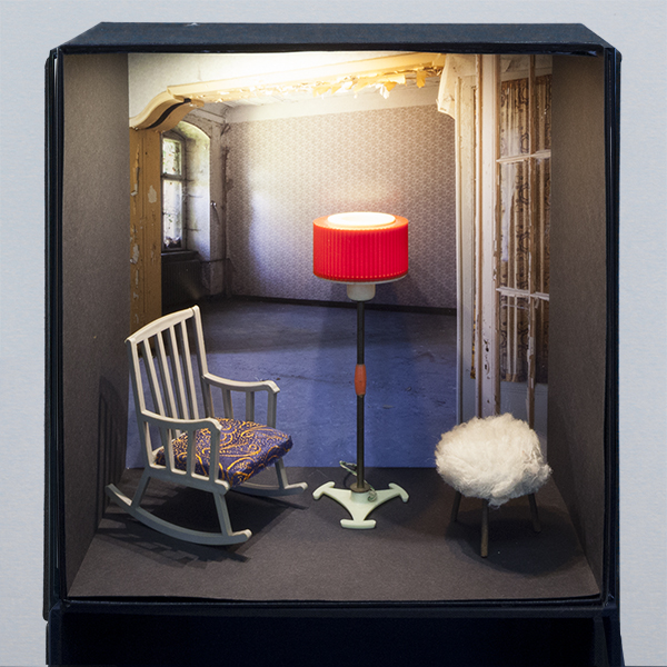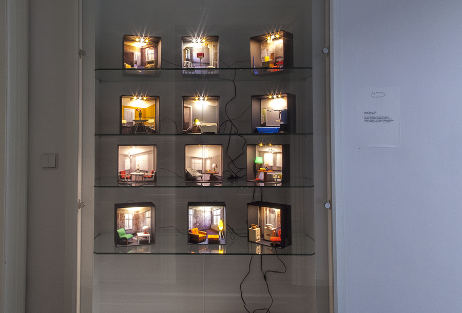 Der zweite Teil der Installation verschiebt den Maßstab: Zwölf Kartons werden zu Miniatur-Wohnräumen, die mit Puppenstubenmöbeln und Fotografien gestaltet sind. Diese kleinen, präzise bestückten Räume wirken auf den ersten Blick idyllisch und einladend. Die auf die Rückwand aufgebrachten Fotografien erweitern den Raumeindruck und brechen zugleich die Wahrnehmung: Einige Fotografien hat die Künstlerin in verlassenen, abgewohnten Häusern aufgenommen. So spiegeln sich die Teile der Installation gegenseitig. Insbesondere wenn der Betrachter in einigen Fotografien die Räumlichkeiten der Galerie wiedererkennt. Die Miniaturen zeigen, wie zerbrechlich und vergänglich Wohnräume sind. Sie reduzieren das Konzept des Wohnens auf seine Essenz: ein Ort, der durch Geschichten und Leben gestaltet wird und sich immer wieder wandelt. Was bleibt von einem Raum, wenn er leer ist? Was macht ihn zu einem Zuhause?