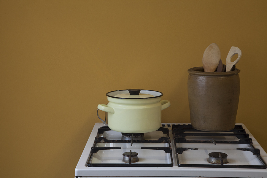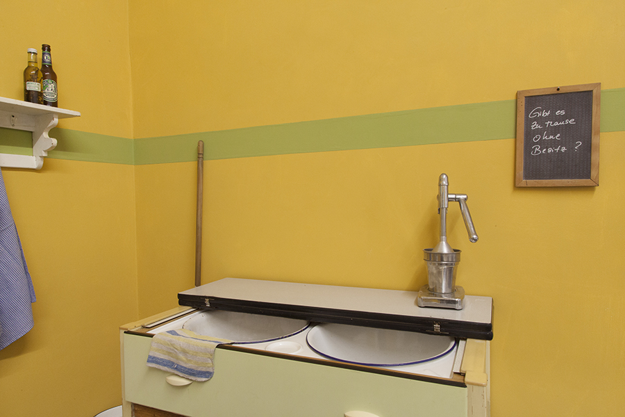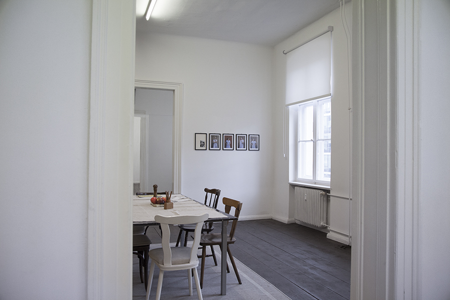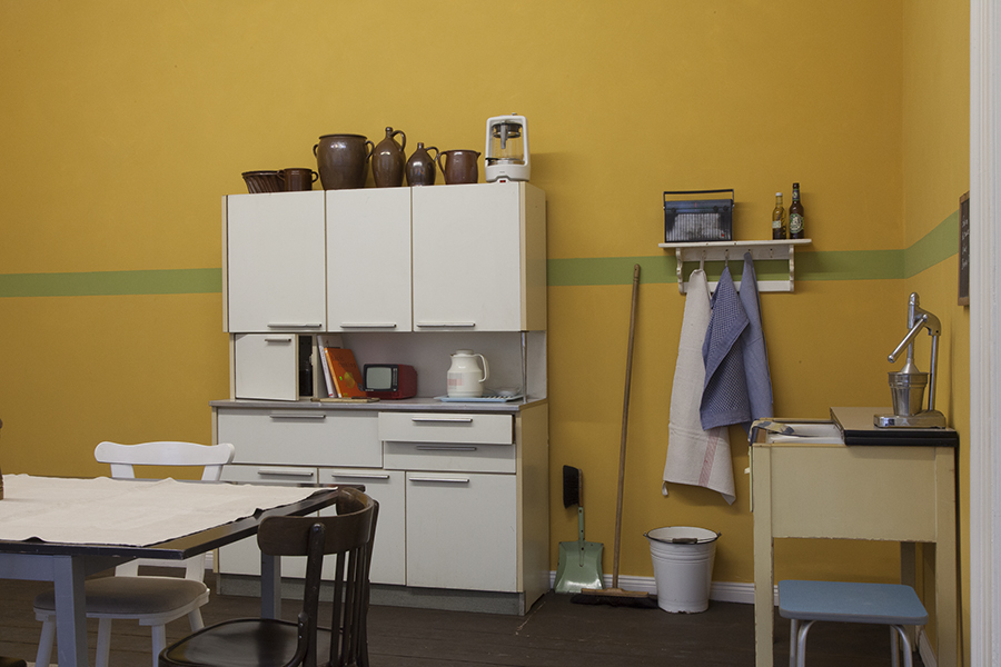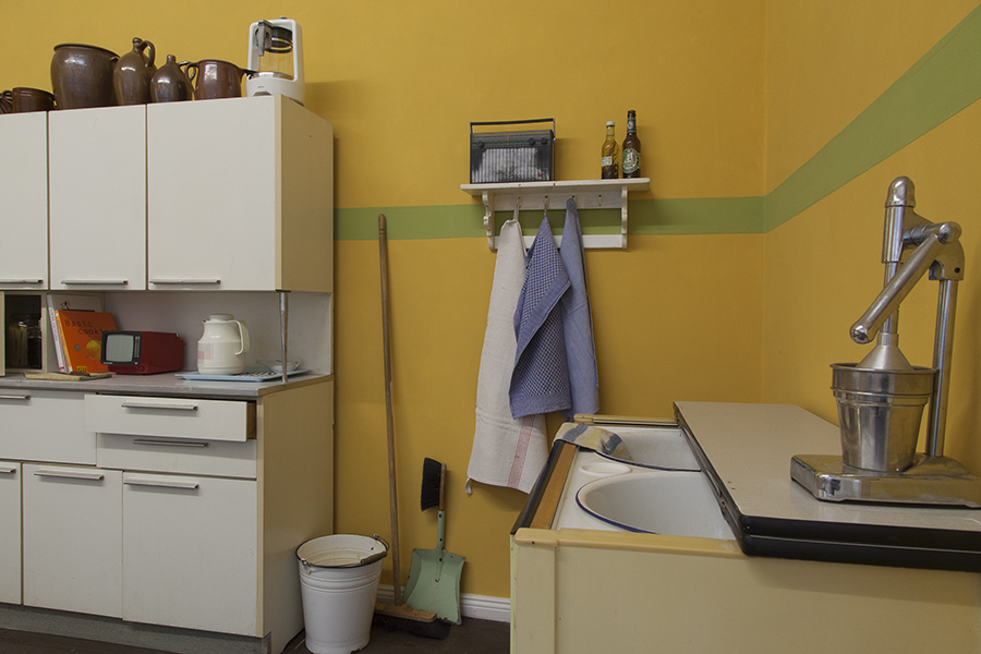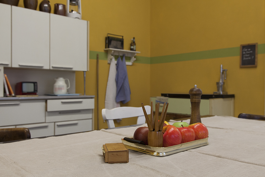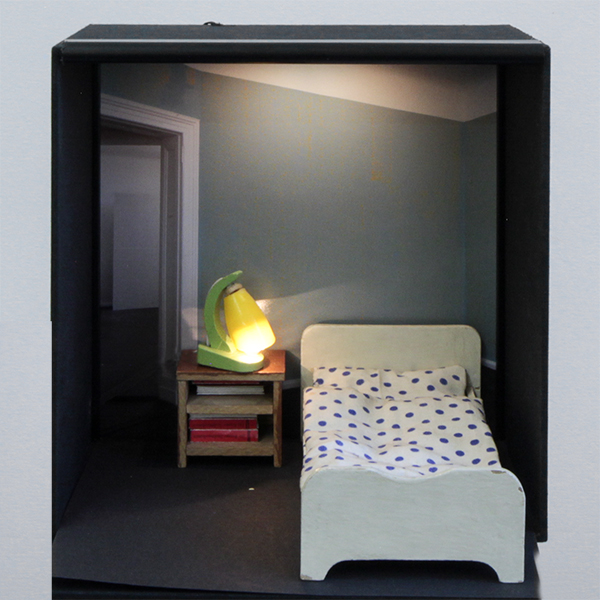 Der zweite Teil der Installation verschiebt den Maßstab: Zwölf Kartons werden zu Miniatur-Wohnräumen, die mit Puppenstubenmöbeln und Fotografien gestaltet sind. Diese kleinen, präzise bestückten Räume wirken auf den ersten Blick idyllisch und einladend. Die auf die Rückwand aufgebrachten Fotografien erweitern den Raumeindruck und brechen zugleich die Wahrnehmung: Einige Fotografien hat die Künstlerin in verlassenen, abgewohnten Häusern aufgenommen. So spiegeln sich die Teile der Installation gegenseitig. Insbesondere wenn der Betrachter in einigen Fotografien die Räumlichkeiten der Galerie wiedererkennt. Die Miniaturen zeigen, wie zerbrechlich und vergänglich Wohnräume sind. Sie reduzieren das Konzept des Wohnens auf seine Essenz: ein Ort, der durch Geschichten und Leben gestaltet wird und sich immer wieder wandelt. Was bleibt von einem Raum, wenn er leer ist? Was macht ihn zu einem Zuhause?